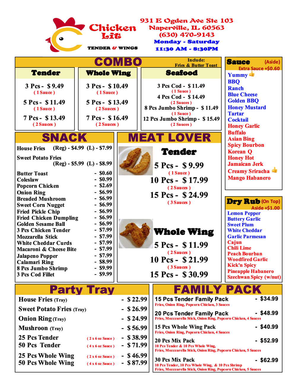 Chicken Lit Tenders & Wings in Naperville, IL, has established itself as the go-to destination for flavorful dining since 2019. Proudly serving the communities of Warrenville, West Chicago, Aurora, Lisle, Plainfield, Romeoville, Bolingbrook, and beyond, we specialize in delicious chicken tenders, succulent whole wings, fresh seafood, savory dumplings, and our signature house fries. Our menu is crafted with a variety of food specials to satisfy every craving. Come enjoy your next meal at Chicken Lit, where great taste and friendly service meet.